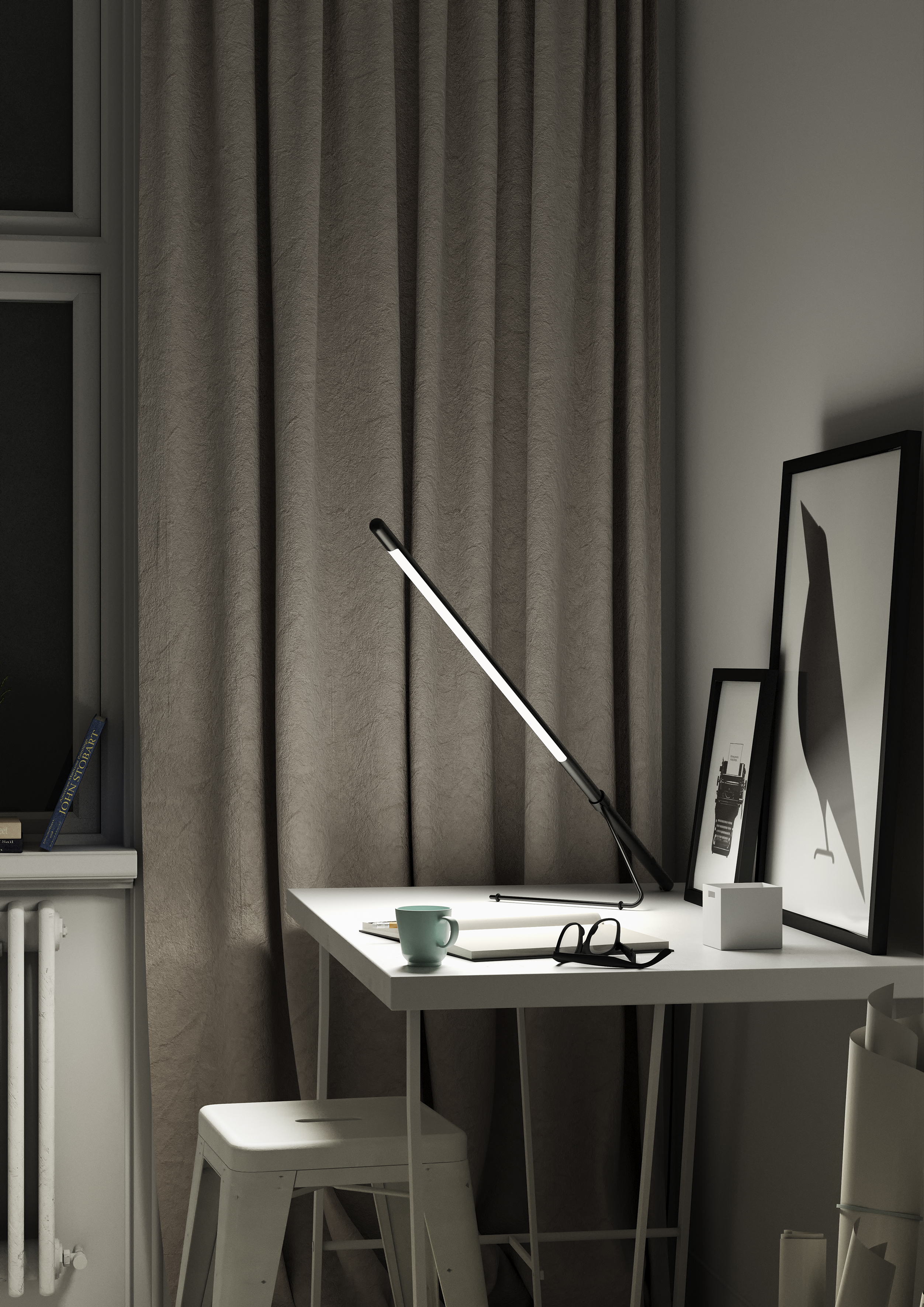 Malgré l’absence d’articulation, la lampe est facilement réglable en hauteur. Pour cela il suffit de déplacer l’anneau de fixation. On peut également modifier l’orientation de l’éclairage en tournant le tube sur son axe. La lumière est émise sur 2/3 de la longueur du tube. Le diffuseur satiné prévient l’éblouissement et crée un agréable éclairage LED très uniforme. De plus, un interruptuer intégré permet de varier l’intensité lumineuse de la lampe, la rendant d’autant plus flexible.